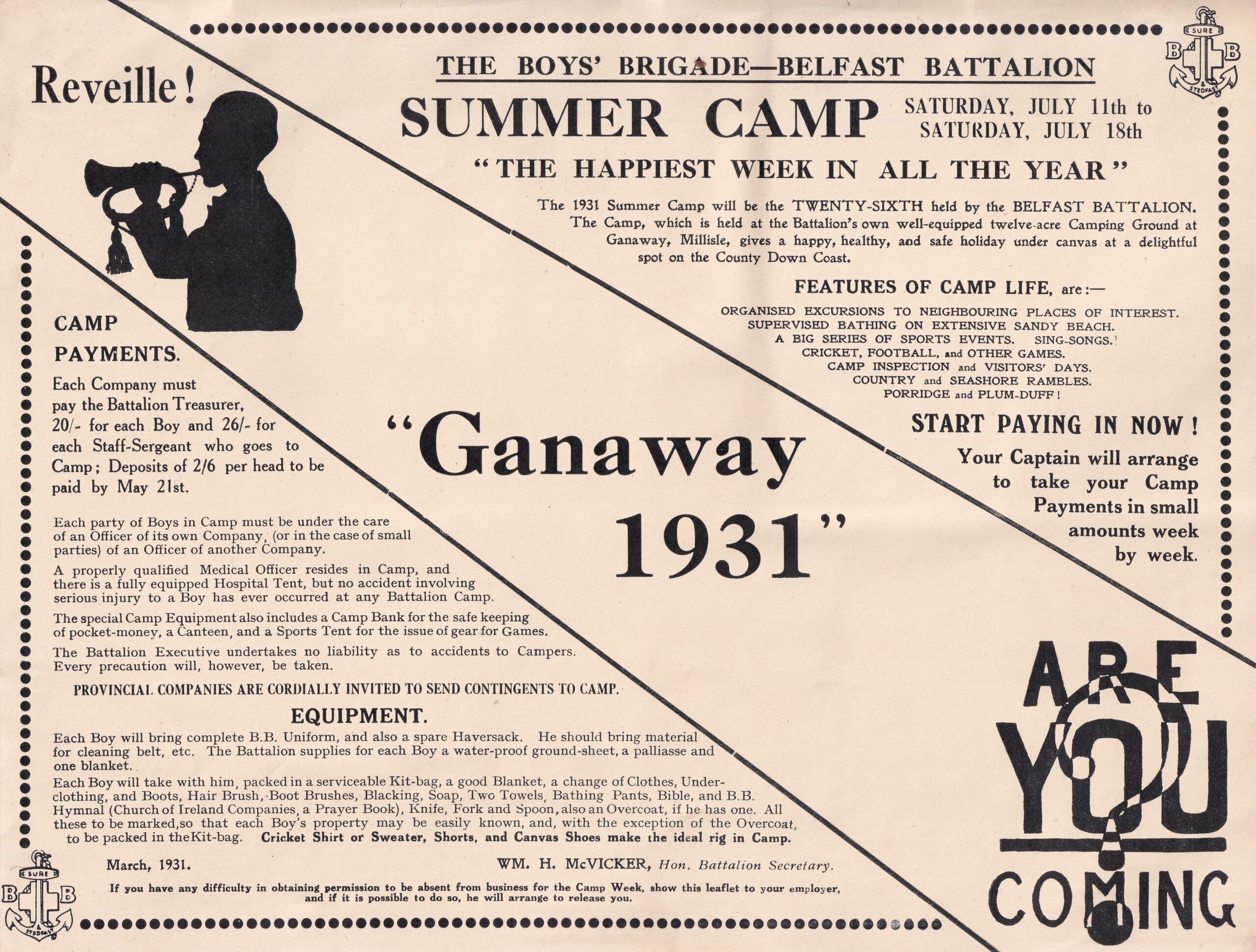 From 1924 camps took place at Ganaway, purchased specifically for the use of the annual Camp. The popularity of the Ganaway Camp increased every year, reaching its peak attendance of more than 1,000 across all ranks in the 1930s. Moving 1,000 Boys and Officers from Belfast to the Ards Peninsula was a logistic task of its own. The Boys would assemble at various points across Belfast, then make their way to a local train station to board the Belfast and County Down Railway train that would take them on their journey to Donaghadee, the first rest stop of the journey.